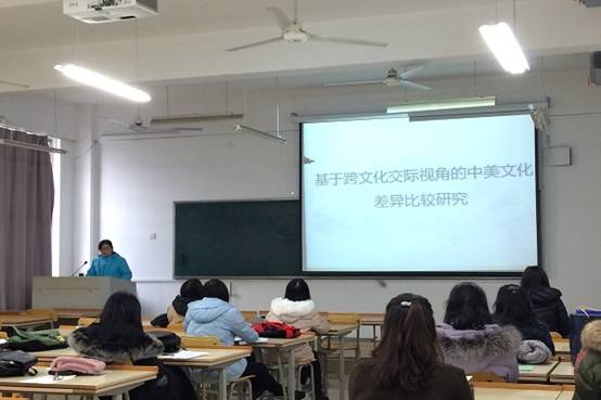 然后,吴群老师做了“基于跨文化交际视角的中美文化差异比较研究”的报告,吴老师通过比较中美文化的校园、家庭、节日、法制、宗教等方面,来分析中美文化交流中的碰撞现象。吴老师的讲解简洁明了,以自己的亲身经历讲述中美差异,使得报告气氛活跃,生动有趣,极大加深了同学们对美国文化的认识和了解。