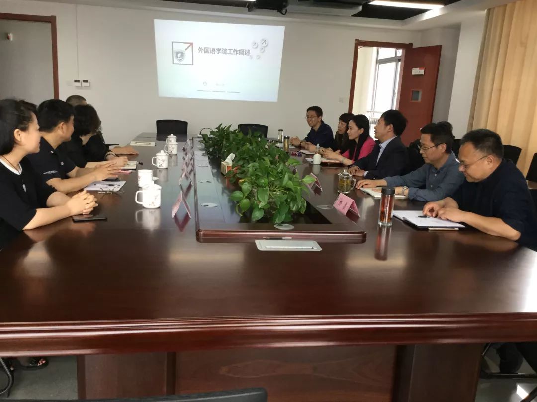 2019年4月26日,新疆农业大学外语学院马琴院长携黄川副院长(援疆干部),新疆维吾尔自治区高校外语教学研究会会长徐世昌教授,大外部王婷主任,英语专业唐彬主任来到8803威尼斯检查中心翡翠湖校区8803威尼斯检查中心进行调研,座谈,参加会议的有韩江洪院长、胡丹书记、杨勇副院长、唐军副院长,英专陈曦主任以及刚援疆回来的大外部胡安琳主任。首先韩江洪院长介绍了学院的基本情况,随后对英语专业“以能力为导向的”人才培养模式、大学英语教学研究、研究生培养、师资队伍建设以及学术研究等方面的成功经验做了交流发言,双方就教学、科研的相关问题也进行了探讨,随后,考察成员参观了外语学院同声传译实训室、 各系部教研室、党建活动室、以及心理咨询室等。最后,双方代表希望今后在大学英语教学改革、专业建设、党建工作等各个方面能有更加深入的交流和合作。