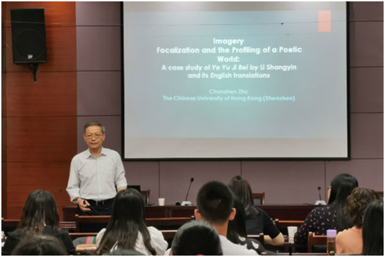 本次报告主题为“Imagery Focalization and the Profiling of a Poetic World: A case study of Ye Yu Ji Bei by Li Shangyin and its English translations”,首先,朱教授邀请在座师生共同朗读《夜雨寄北》,声情并茂,带领同学们陶醉于中华诗词的美妙之中。紧紧围绕该诗的境界,措辞,朱教授运用数种修辞方法,从多个方面深入浅出,和师生共同探讨“巴山夜雨涨秋池”中“涨”字的妙用及其涉及的时间概念,其妙趣横生的比喻令大家体察到生活之可爱,另外,他又不知不觉地将美学课题中时间的空间化概念与“何当共剪西窗烛”联系起来,独具匠心。最后,朱教授与在座师生分享了自己当前研究的法国哲学家加斯东·巴什拉的作品以及思想观点,学术造诣深厚,讲解详尽透彻,帮助同学们拓宽了研究范围,丰富了研究思路。