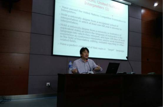 本次报告主题为“全球化人才之口译自主学习路径”,首先,许教授指出,大数据时代,海量学习资源、图文声像的媒体合成等必将催生广泛自主学习,并讲解了UN、EU等机构职业译员招聘的资格与能力要求以及AIIC职业译员的素质要求,条理清晰、透彻详尽,以期对照此标准,结合中国口译教学实践,探讨口译自主学习模型构建。接着,许教授就可行性学习原则、学习策略优化及优质学习资源的整合等具体问题给出建议,见解独到,深入浅出,为在场师生提供了切实可行的口译自主学习方法,以便通过自主学习,检验听、说、读、写能力,全面提升英语综合能力,使在场师生受益匪浅。