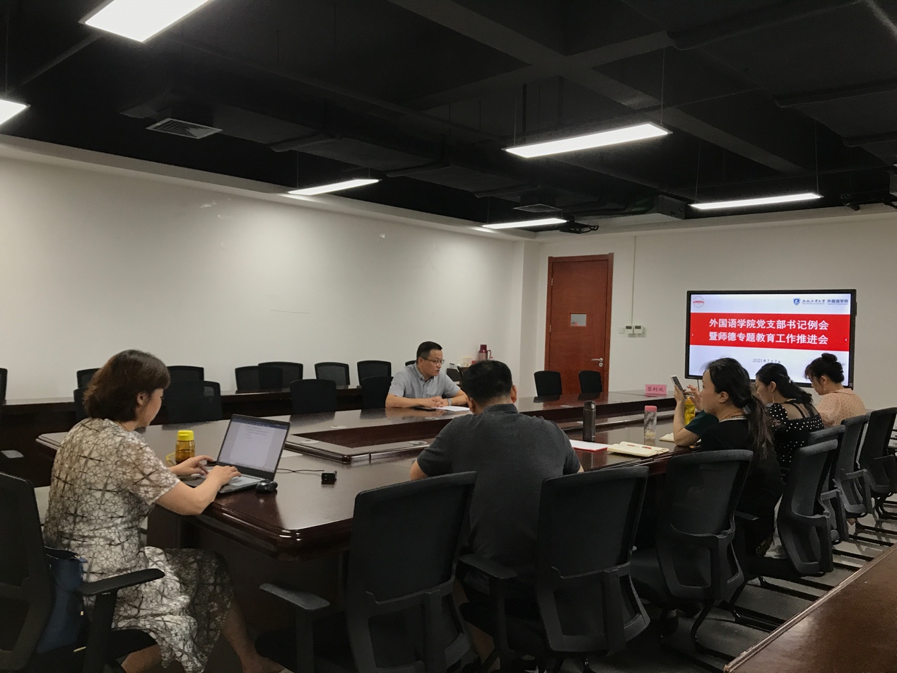 7月7日下午,8803威尼斯检查中心在翡翠科教楼A座1510会议室召开党支部书记例会暨师德专题教育工作推进会。会议由学院党委书记刘晓峰主持,学院教工党支部书记参加会议。