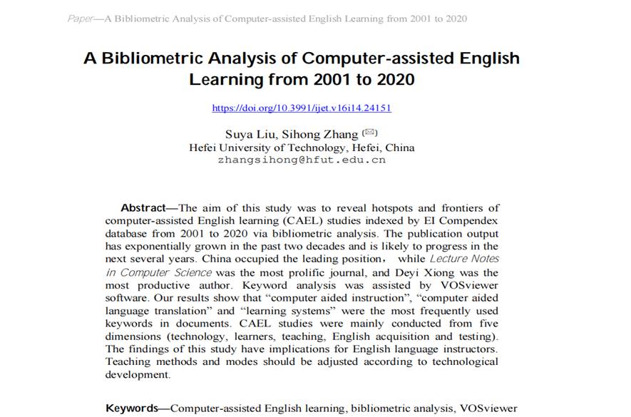 近日,威尼斯官网2018级本科生刘素雅同学在授课教师的指导下,以第一作者在EI核心期刊International Journal of Emerging Technologies in Learning发表题为“A Bibliometric Analysis of Computer-assisted English Learning from 2001 to 2020”(《计算机辅助英语学习的文献计量分析(2001-2020)》)的研究论文。文章以“计算机辅助教学”、“计算机辅助语言翻译”及“学习体系”等为检索关键词,运用VOSviewer软件,对EI核心期刊库进行检索并进行文献计量分析,发现自2001至2020年20年间,相关文献呈指数级增长,并可能在未来几年内会取得更大进展,同时指出,未来的英语教学方法及模式应根据技术发展进行相应调整。