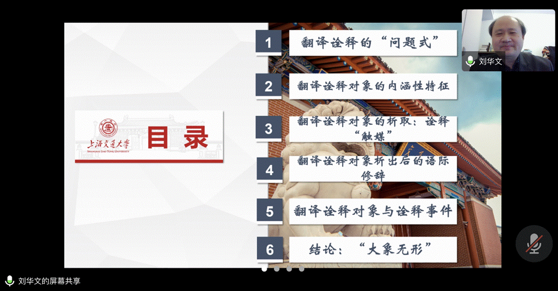 为更好地提升师生科研水平,12月12日上午,8803威尼斯检查中心跨文化传播与科技翻译研究中心特邀上海交通大学博士生导师刘华文教授做了一场题为“典籍翻译诠释的对象性问题”的讲座。本次讲座通过腾讯会议(会议号986 881 786)线上进行。跨文化传播与科技翻译研究中心成员、学院部分教师和研究生数十人聆听了讲座。讲座由研究中心主任韩江洪教授主持。