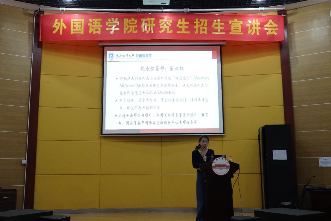 5月27日下午,学院2023年度研究生招生首场宣讲会在宣城校区大学生活动中心小报告厅举行。本次宣讲会由英语系陈路林主任主持,学院教学院长黄川带领研究生招生老师进行招生宣传。宣讲会上,徐鄢雯老师从学位点详情、师资队伍、教学平台与设施、导师科研成果简介、招生详情、就业与深造情况以及研究生学习生活等方面给在场的同学们进行了详细地讲解。