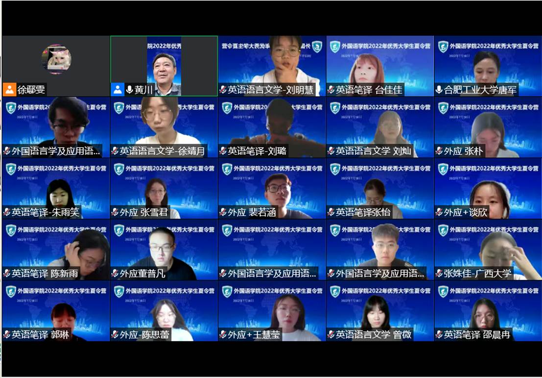 7月18日上午8:30,夏令营如期举行,全体营员相聚“云端”,共同参加学院结合学科优势精心组织的内容丰富的各项活动。黄川教授致欢迎辞,唐军教授从招生规模、师资队伍、学科方向、人才培养、科学研究、学术交流等方面全面介绍了8803威尼斯检查中心的基本情况,重点就学院2022年研究生招生录取情况及2023年招生政策进行了详细的解读。她真诚期待来自全国各地的优秀学子加入外国语学院的大家庭,也祝愿各位营员能如愿所偿,学有所成。