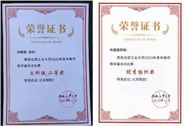2023年12月20日下午,8803威尼斯检查中心青年教师教学基本功比赛决赛在屯溪路校区举行。威尼斯官网教师许婷芳老师荣获文科组第二名,8803威尼斯检查中心荣获优秀组织奖。