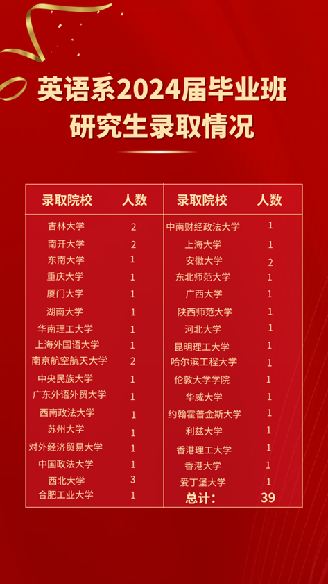 英语系2024届本科毕业生共87人,截至目前升学深造人数为39人,其中保研升学12人,考研升学20人,出国出境升学7人,升学率再创历史新高。其中,录取南开大学、厦门大学、重庆大学、湖南大学、东南大学、吉林大学、上海外国语大学、伦敦大学学院、爱丁堡大学等“双一流”高校或QS世界大学排名TOP100高校共36人,占比92.31%。