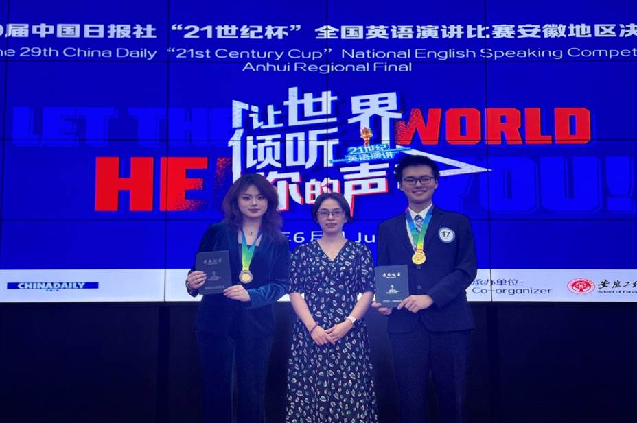 近日,第29届中国日报社“21世纪·可口可乐杯”英语演讲比赛安徽省决赛在安徽工程大学成功举行并圆满落幕。本次比赛汇聚了来自全省十余所高校的21名选手,围绕“传统文化复兴”主题各展风采。经过激烈的角逐,威尼斯官网经济学院陈安熠同学(潘晨曦老师指导)和朱灵娜同学(郑园琴老师指导)脱颖而出,分获安徽省冠军和季军两项殊荣,成功晋级全国总决赛。