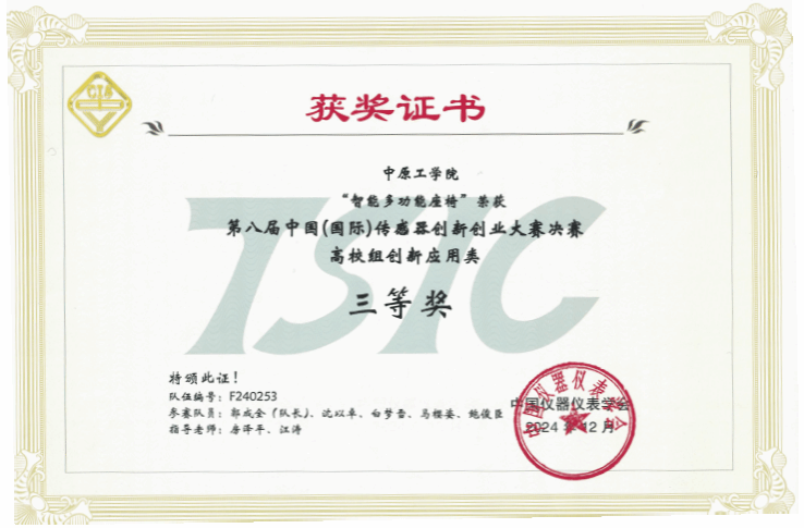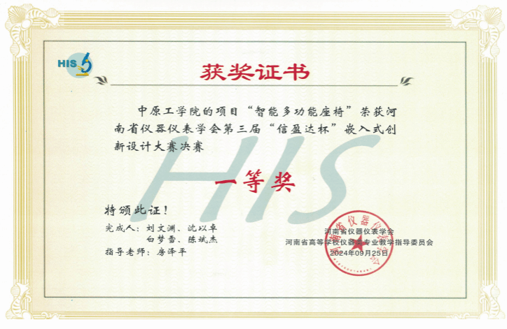 11月30日-12月1日,第八届中国(国际)传感器创新创业大赛获全国总决赛在郑州国际会展中心举行。在KY官网房泽平和江涛老师指导下,学生团队郭成全、沈以卓、白梦雪、马樱姿、鲍俊臣完成的作品《智能多功能座椅》进入全国总决赛,并最终荣获“高校组创新应用类”三等奖。此前,该作品获得第八届中国(国际)传感器创新创业大赛河南赛区选拔赛一等奖、第三届“信盈达杯“嵌入式创新设计大赛一等奖。