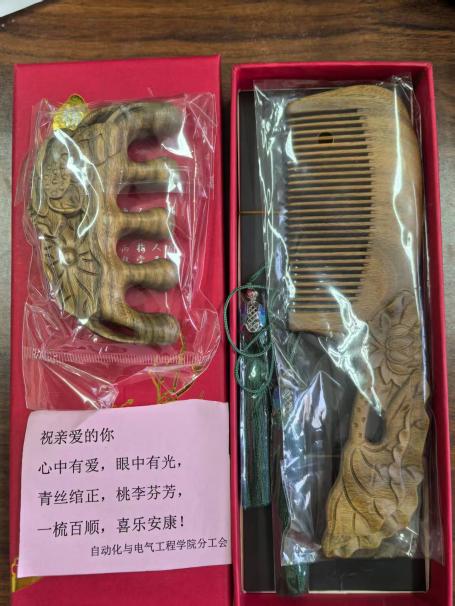 自电学院分工会为每位女教工准备了雕花木梳礼盒和节日卡片,木梳在中国传统文化中承载了顺达、梳理烦忧的美好寓意,学院分工会希望教师们在繁忙工作之余关注身心健康,借助每日梳头放松身心,工会永远是每位教工的贴心人,随时为大家梳理困难,疏通心结。