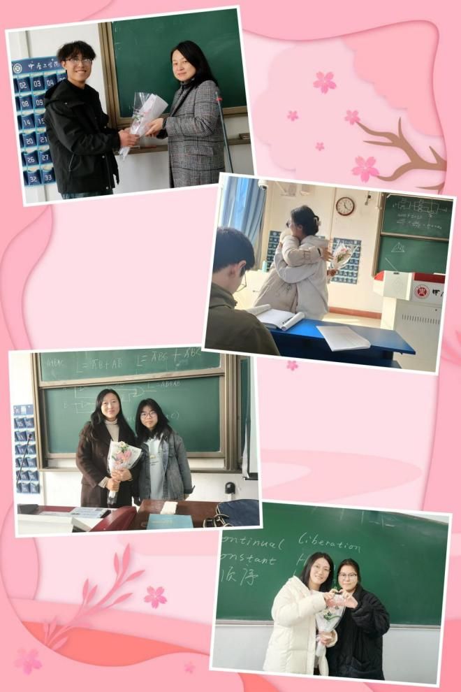 3月6日-7日,学生代表走进教室为当天授课的女教师们献上美丽的花束,并带领班级同学向授课老师致以最诚挚的问候。收到花束的老师表示:这些花束不仅美丽,更饱含学生的用心。这是最特别的妇女节礼物!